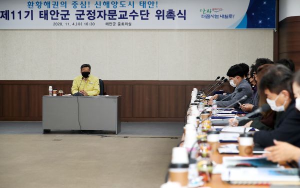 군은 지난 4일 군청 중회의실서 가세로 군수, 관련 실·과장, 군정자문교수단 등 50여명이 모인 가운데 ‘제11기 군정자문교수단 위촉식’을 개최했다민선7기 후반기 비전인 ‘환황해권 해양경제의 중심축, 신해양도시 태안’ 건설을 위해 새롭게 구성된 제11기 군정자문교수단은 서울대 등 국내 유수 대학의 저명한 정책 전문가들이 다수 참여했으며 4차 산업 해양·환경·생태 문화·관광·체육 교육·복지·안전 도시·지역개발 5개 분야 26명으로 구성됐다.