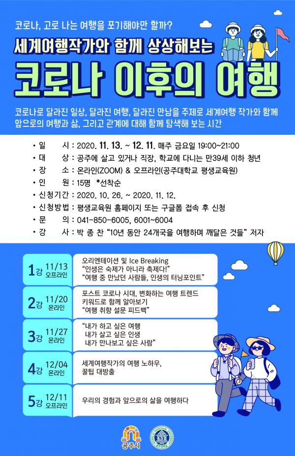 [충청뉴스큐] 공주시가 오는 13일 개강하는 공주시민대학 특별과정 ‘세계여행 작가와 함께 상상해보는 코로나 이후의 여행’ 수강생을 모집한다.