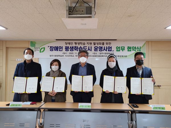 [충청뉴스큐] 청주시 평생학습관이 6일 ‘2020년 장애인 평생학습도시 운영 사업’ 추진 기관인 청주시장애인종합복지관, 혜원장애인종합복지관, 다사리학교, 무지개도서관을 비롯한 27개 연계 협력 기관·단체와 장애인 평생교육 활성화를 위한 업무 협약을 체결했다.
