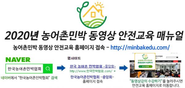 이번 온라인 교육은 코로나19 확산 예방을 위해 집합교육을 최소화하기 위한 방안으로 한국농촌민박협회에 의뢰해 민박사업자가 지켜야할 소방, 안전, 위생 및 서비스를 주제로 3시간 과정으로 편성 운영했다.