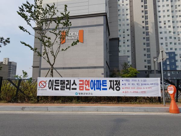 현재 영동군의 금연구역지정 공동주택은 영동읍 소재 지평 더웰 1차, 2차아파트와 허브시티아파트, 이든팰리스아파트 4개소가 신청해 지정됐다.