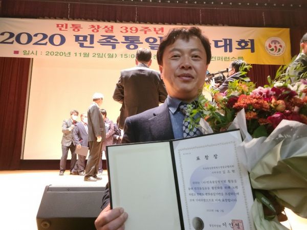 김 사무국장은 최근 전국 17개 시·도협의회와 228개 시·군·구, 읍·면·동협의회, 여성·청년협의회 등 국내 최대 민간통일단체인 민족통일중앙협의회가 민주평통 창설 39주년을 기념해 서울 코엑스 컨퍼런스룸에서 개최한 ‘2020 국민과 함께하는 평화콘서트 및 민족통일전국대회’에서 이 같은 수상의 영예를 안았다.