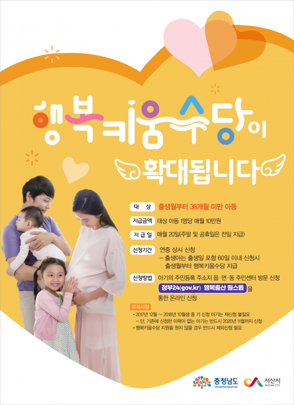 [충청뉴스큐] 충남 서산시가 저출산 문제와 양육에 따른 시민들의 경제적 부담을 경감하기 위해 행복키움수당 지원 대상을 만 36개월 미만 아동까지로 확대한다.