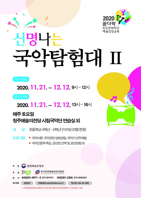청주시에서 진행하는 ‘2020년 꿈다락 토요문화학교 예술감상교육 – 신명나는 국악탐험대Ⅱ’ 교육은 11월 21일 ~ 12월 12일 9시~12시 , 오후 1시~오후 4시 총 2기수로 나눠 진행되며 매주 토요일에 청주예술의전당에서 운영된다.