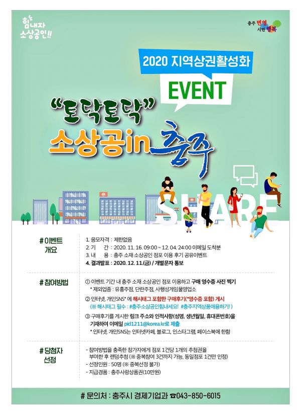 김시한 경제기업과장은 “코로나19로 다 함께 어려운 시기지만 지역 상권이 살아야 충주경제도 활성화된다”며 “충주시민분들께서는 이벤트 응모에 많은 관심과 참여를 바란다”고 말했다.