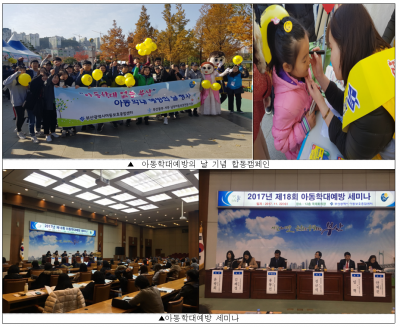 또한, 22일 오후 2시부터 시청 12층 국제회의장에서 아동복지시설 종사자, 아동복지유관기관 종사자 등 300명이 모여 ‘재학대 예방을 위한 지역사회서비스 개입방안’ 이라는 주제로 아동학대예방 세미나를 개최 할 예정이다.