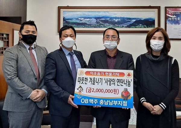 임상율 OB맥주충남남부지점장은 이날 이존관 부시장을 만나 본격적인 겨울 추위를 앞두고 관내 저소득 취약계층이 따뜻한 겨울을 보낼 수 있도록 연탄을 전달해 달라며 200만원을 기탁했다.