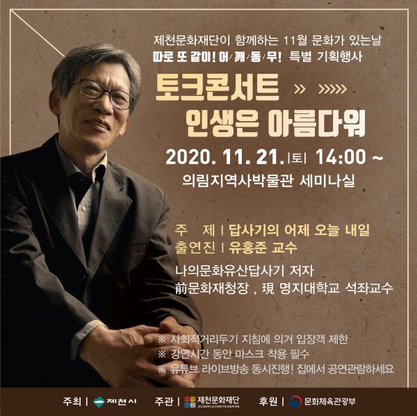 재단은 코로나 19 확산방지를 위해 온라인 라이브방송 토크콘서트 강연을 기획했으며 21일에 의림지역사박물관 세미나실에서 다양한 장르의 토크콘서트를 제공하고자 “나의문화유산답사기” 저자이자 前문화재청장, 現 명지대 석좌교수인 유홍준 교수와 KBS1 6시내고향 ‘발길따라 고향기행’ 고정리포터 겸 국악인으로 활동하는 최예림 씨를 초청해‘인생은 아름다워 토크콘서트’를 현장 라이브방송으로 하고 오는 25일 10시에 녹화분 방영도 진행한다고 밝혔다.