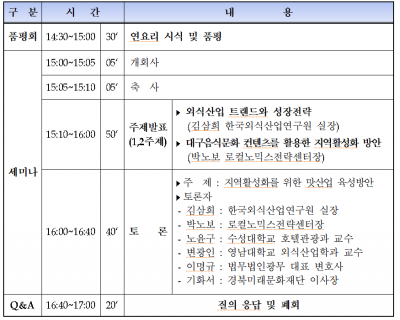 세미나는 외식산업의 트렌드와 성장전략, 대구 음식문화 콘텐츠를 활용한 지역활성화 방안 등 2가지 주제 발표를 시작으로 ‘지역활성화를 위한 대구 맛산업 육성방안’에 대해 각 분야 전문가 6명의 토론이 이루어진다.
