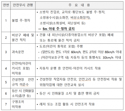‘7대 안전무시 관행’은 불법 주·정차 비상구 폐쇄 및 물건 적치 과속운전 안전띠 미착용 건설현장 안전규칙 미준수 등산 시 인화물질 소지, 구명조끼 미착용이다.