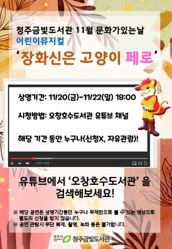[충청뉴스큐] 청주금빛도서관이 11월 문화가 있는 날 행사로 어린이 뮤지컬 ‘장화신은 고양이 페로’를 온라인 공연한다.