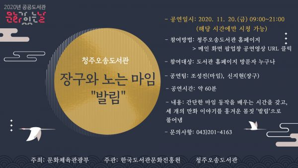 [충청뉴스큐] 청주오송도서관이 이달 20일 오전 9시부터 오후 9시까지 ‘2020년 공공도서관 문화가 있는 날’사업의 일환으로 2차 온라인 공연 장구와 노는 마임 ‘발림’을 운영한다.