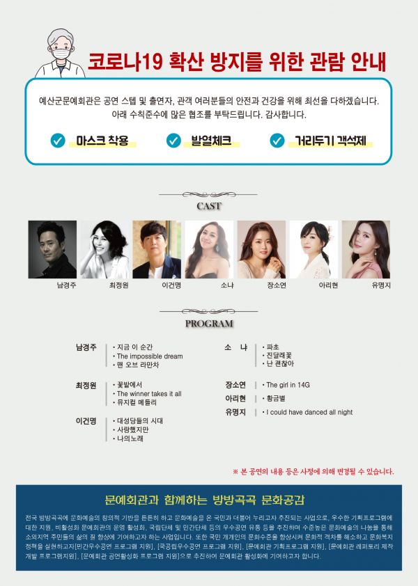 이번 공연은 ‘2020년 방방곡곡 문화공감사업 선정작’으로 대한민국 대표 뮤지컬 배우인 남경주, 최정원, 이건명, 소냐가 들려주는 뮤지컬 갈라 콘서트로 배우들이 직접 출연한 작품의 대표곡들을 노래한다.