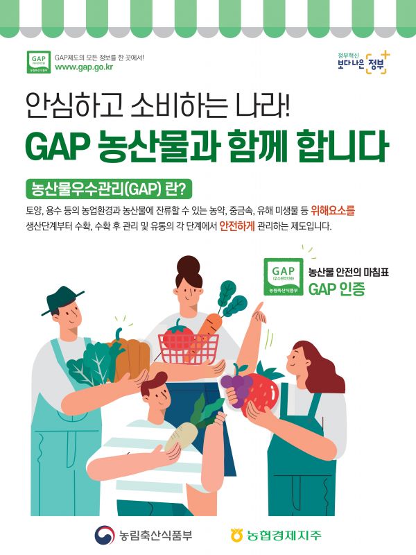 김덕환 농업정책과장은 “코로나19로 건강하고 안전한 먹거리에 대한 국민들의 관심과 요구가 증대되고 있다”며 “GAP 검사비 지원 신청으로 농산물 안전성 인증에 도움을 받기 바란다”고 당부했다.
