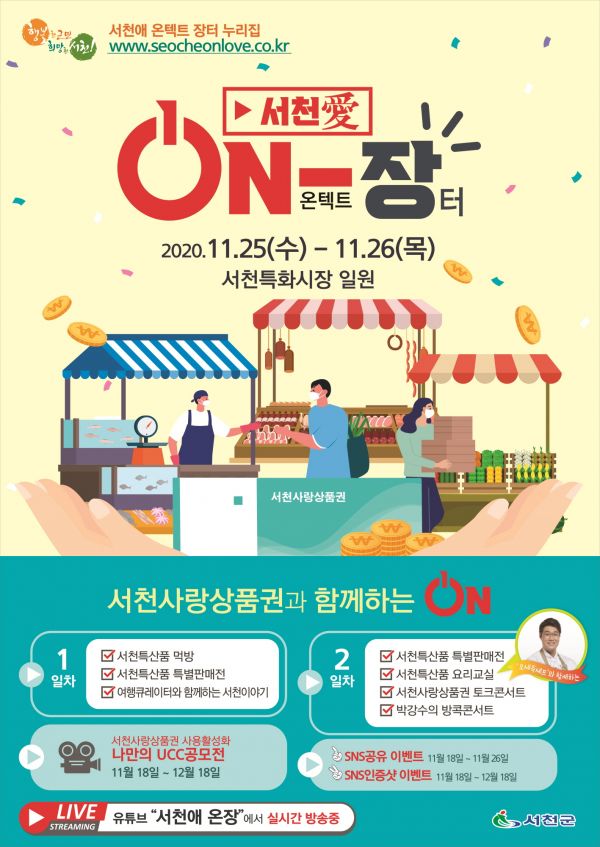 [충청뉴스큐] 서천군이 코로나19로 침체한 소비 진작과 서천사랑상품권의 활성화를 위해 오는 25일부터 26일까지 ‘시장애 온-장’ 행사를 비대면으로 개최한다.