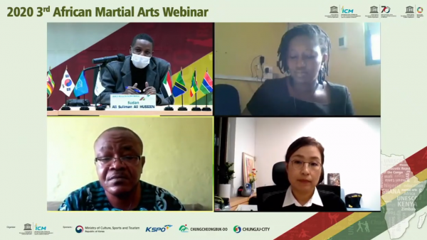 [충청뉴스큐] 충북 충주시 소재 국제기구인 유네스코 국제무예센터는 전 세계 코로나-19 지속 확산 및 사회적 거리 두기 강화를 고려해 2020 제3회 아프리카 무예 웨비나를 지난 24일 25일 이틀간 온라인 화상 회의 형태로 개최했다.