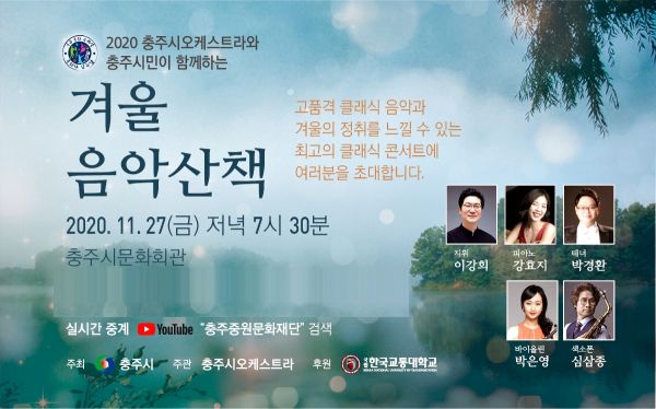 [충청뉴스큐] 충주시는 오는 27일 저녁 7시 30분 충주시문화회관에서 이강희 지휘자의 지휘로 열리는 충주시오케스트라의 ‘2020 충주시민과 함께하는 겨울 음악 산책’을 온라인으로 생중계한다.