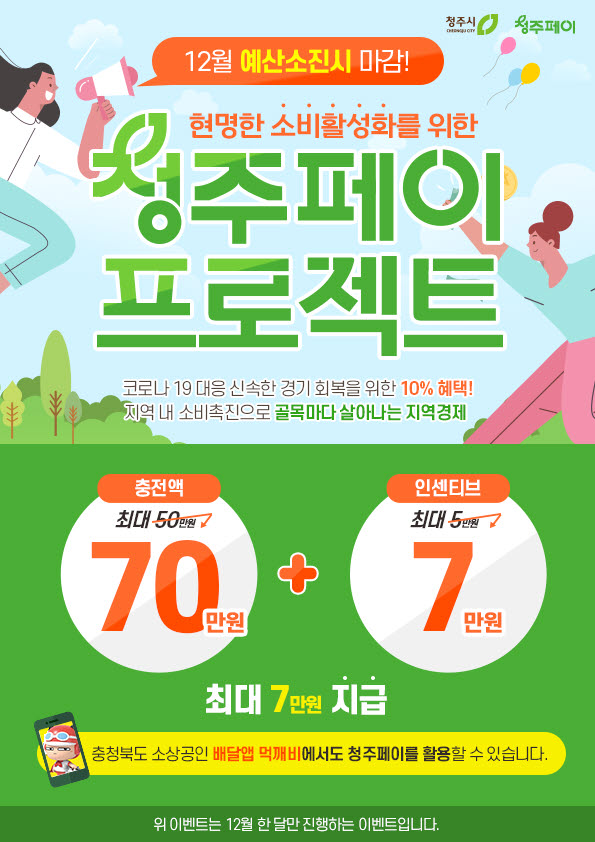 [충청뉴스큐] 청주시가 코로나19 장기화로 침체된 경제위기 극복을 위해 청주페이의 12월 충전한도를 70만원으로 상향해 인센티브 10% 혜택을 이어나갈 방침이다.