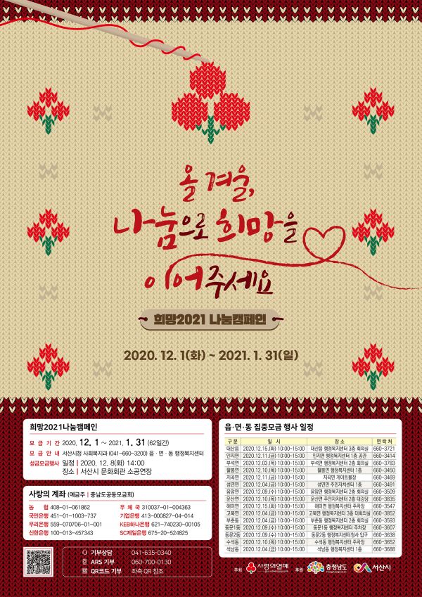[충청뉴스큐] 서산시가 오는 12월 1일부터 내년 1월 말까지 ‘나눔으로 희망을 이어주세요’라는 슬로건으로 '희망 2021 나눔 캠페인'을 추진한다.