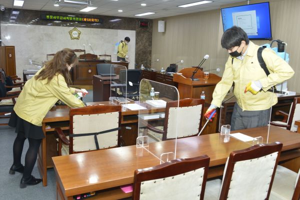 군의회에서는 회의 진행 시 코로나 19의 확산을 방지하기 위해 의원 및 집행부 자리에 비말차단 가림막을 설치하고 회의장 출입 시 손소독과 체온을 측정하고 있으며 회의 시작과 종료 후 수시로 소독을 실시해 법령상 주어진 지방의회의 의무를 차질없이 수행할 수 있도록 최선을 다하고 있다.