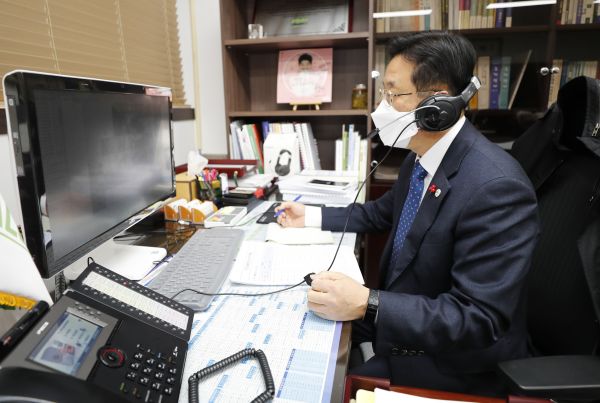 [충청뉴스큐] 충북 괴산군이 코로나19 재확산으로 행정안전부 온-나라 이음 PC 영상회의 시스템을 이용해 간부회의를 비대면 영상회의로 실시한 가운데 이차영 군수가 회의를 주재하고 있다.