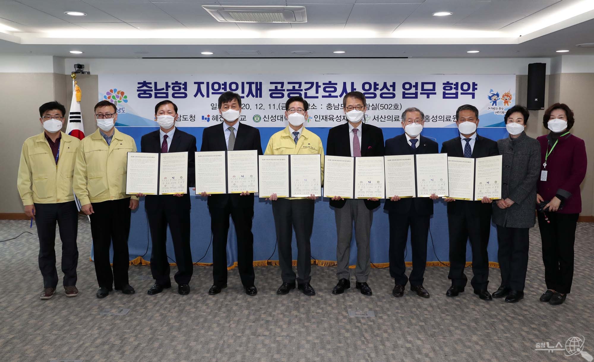 양승조 지사는 지난11일 도청 상황실에서 이세진 혜전대 총장, 김병묵 신성대 총장, 한영배 충남인재육성재단 상임이사, 김영완 서산의료원장, 박래경 홍성의료원장과 ‘충남형 지역인재 공공간호사 양성’ 협약을 체결했다.