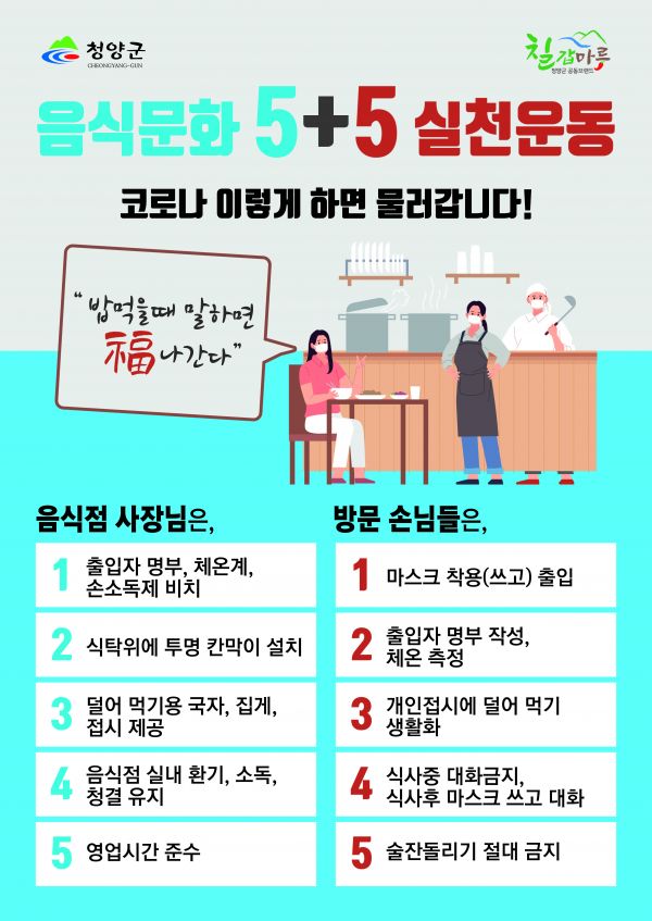 [충청뉴스큐] 청양군이 코로나19 2차 확산 상황을 빠르게 끝내고 추가전파 가능성을 차단하기 위해 ‘음식문화 5+5 실천운동’을 전개하고 있다.