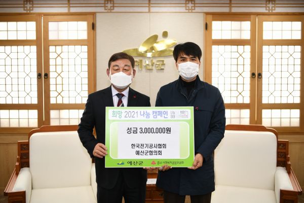 군은 지난 15일 한국전기공사협회 예산군협의회가 300만원, 주식회사 미래엔서해에너지에서 1000만원, 건설기계 개별연명사업자협의회 예산지회가 100만원을 ‘희망2021 나눔캠페인’ 이웃돕기 성금으로 각각 기탁했다고 밝혔다.