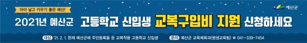 군 관계자는 “학생들이 빠짐없이 혜택을 받을 수 있도록 사업 추진에 만전을 기하겠다”며 “앞으로도 예산의 미래를 이끌어 나갈 학생들을 위한 교육환경 조성과 교육복지 확대를 위해 최선을 다하겠다”고 말했다.