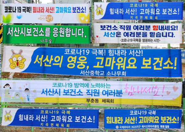 현수막에는 코로나19 극복 힘내라 서산 고마워요 보건소 서산의 영웅, 고마워요 보건소 보건소 직원 여러분 힘내세요 서산은 여러분을 믿습니다 등 다양한 문구가 담겼다.