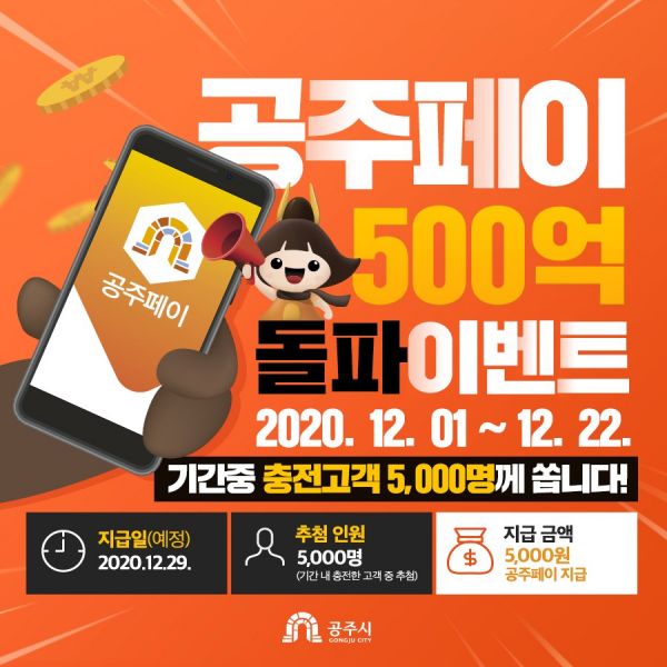 [충청뉴스큐] 공주시가 충남 최초 모바일 상품권 ‘공주페이’의 발행액 500억 돌파를 기념해 새해맞이 이벤트를 실시한다고 17일 밝혔다.