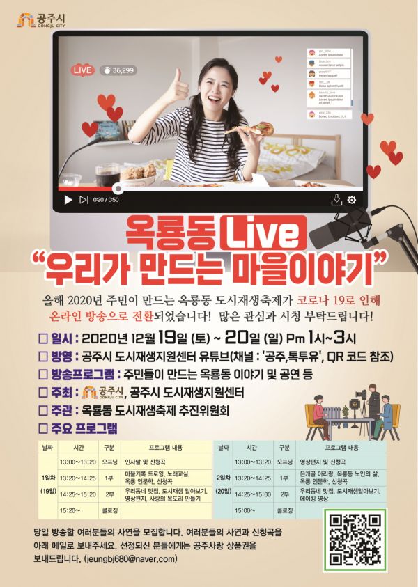 [충청뉴스큐] 공주시와 도시재생지원센터는 한 해 동안의 도시재생사업 성과를 공유하고 지역주민과 소통하기 위한 ‘옥룡동 도시재생마을축제’를 오는 19일과 20일 양일간에 걸쳐 개최한다.