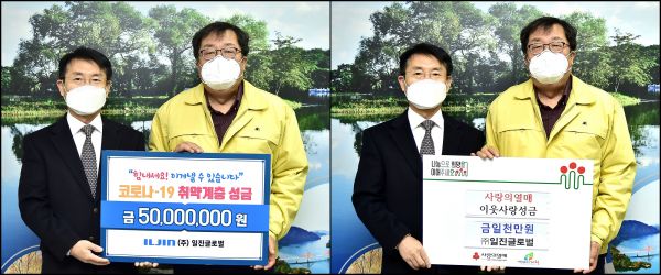 ㈜일진글로벌은 지난 3월 코로나19 방역물품 후원과 8월 수재피해성금 및 물품지원 그리고 최근 11월 인재육성장학금 3,000만원을 기탁한데 이어 코로나 19 장기화와 경기침체 상황 속 지속된 나눔을 실천하고 있어 지역사회의 본보기가 되고 있다.