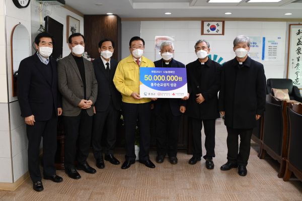 홍성군은 지난 22일 군수실에서 김석환 홍성군수, 대전교구 교구장 유흥식 라자로 주교, 최교성 신부 등이 참석한 가운데 성금 기탁식을 가졌다.
