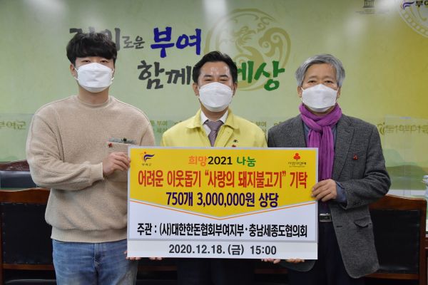 박정현 부여군수는 “매년 꾸준하게 지역사회의 소외계층을 위한 나눔 활동에 앞장서 주시는 대한 한돈협회 부여지부에 진심으로 감사드리며 전달받으신 모든 분들이 우리 한돈을 맛있게 드시고 겨울철 면역력도 챙기며 코로나19도 함께 극복할 수 있는 힘이 되길 바란다”고 말했다.