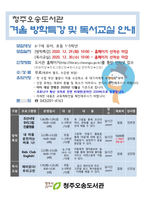 [충청뉴스큐] 청주오송도서관이 겨울방학을 맞은 어린이들을 대상으로 운영하는 겨울방학특강 및 독서교실 수강생 모집을 각각 29일 30일 10시부터 도서관 홈페이지를 통해 선착순 접수받는다.