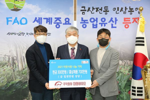 진산면에 위치한 ㈜대화바이오는 연말연시를 맞아 성금 300만원과 700만원 상당 홍삼제품을 군에 전달했다.