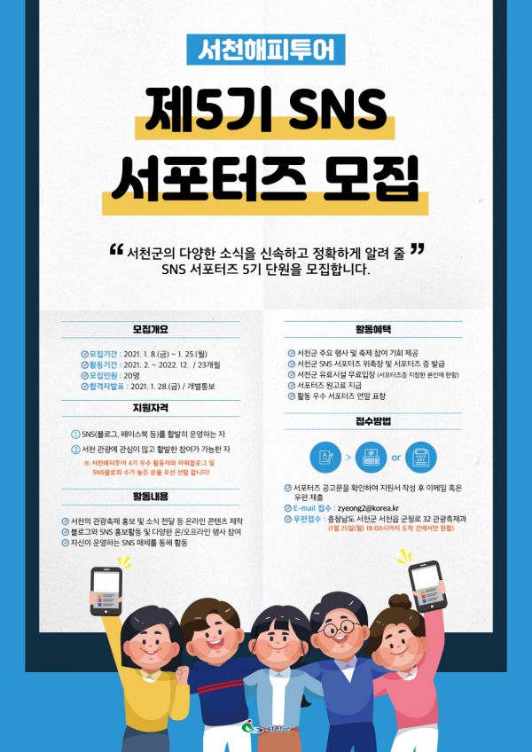 이번에 모집하는 SNS서포터즈는 각종 블로그 및 SNS를 통해 축제 및 관광정보 등 서천군의 생생한 관광 소식을 홍보하는 서천 관광 알림이 역할을 담당하게 된다.