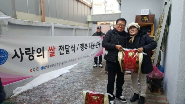 연맹 회원들이 십시일반 모은 성금과 청주제일새마을금고 협찬으로 백미 20kg 23포와 떡국떡 50kg을 구입해 전달하고 이웃 간에 따뜻한 정을 나눴다.