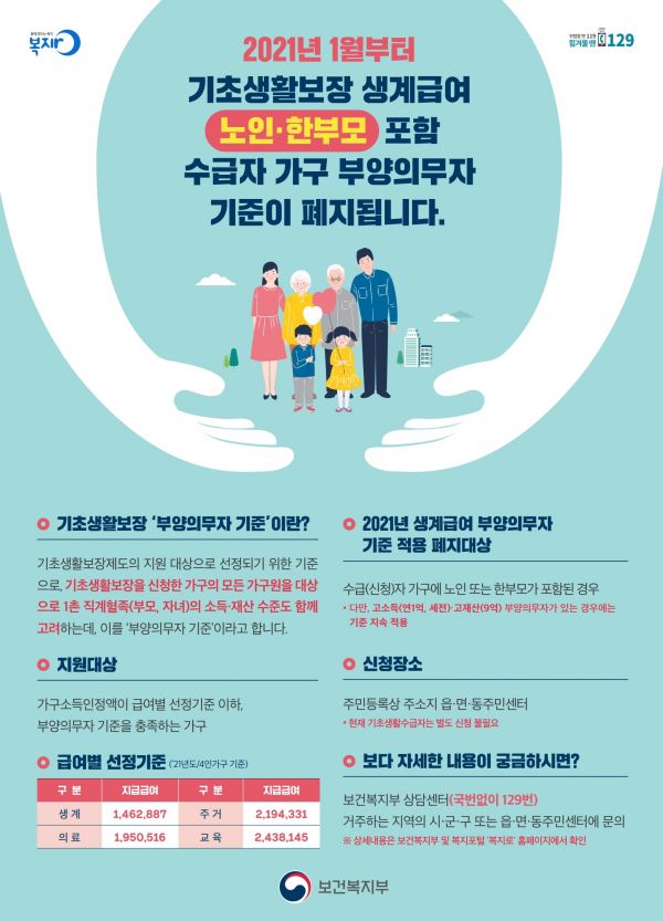 이에 만65세 이상 노인 또는 한부모 포함 가구가 1월부터 생계급여를 신청하면 부양의무자 기준 적용을 제외한다.