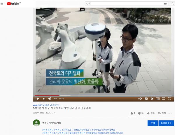 군은 온라인 주민설명회 안내문을 지난 8일 우편으로 개별통지 했으며 영동군 지적재조사팀 유튜브에 설명회 영상을 게시했다.
