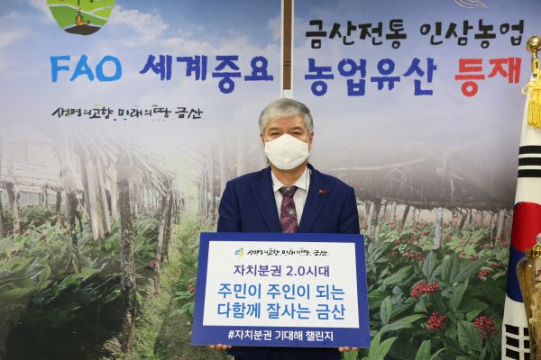 [충청뉴스큐] 문정우 금산군수는 지난 15일 자치분권 2.0시대 개막을 응원하기 위한 '자치분권 기대해' 챌린지에 동참했다.