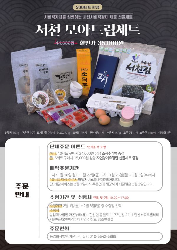 ‘서천모아드림세트’ 구매를 위한 사전예약은 농업회사법인 가온누리를 통해 가능하며 다음달 2월 1일부터 8일 중 희망 수령 일을 선택하면 된다.