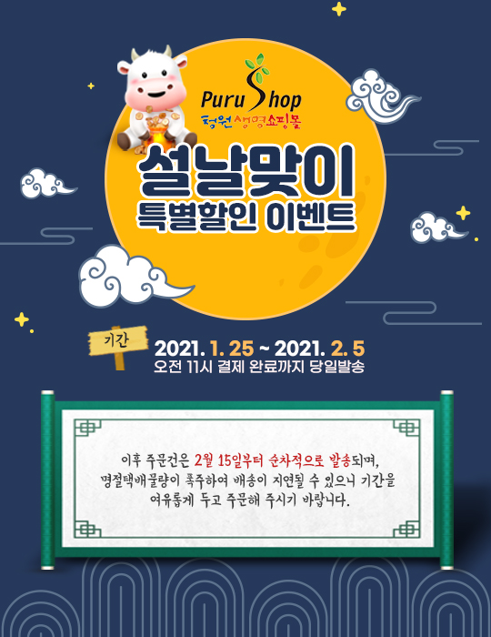 [충청뉴스큐] 청주시 농특산물 쇼핑몰인 청원생명쇼핑몰‘푸루샵’이 25일부터 설맞이 할인 이벤트 등을 진행한다.