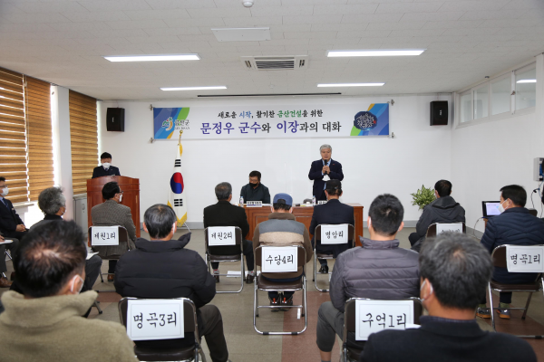 양일에 걸친 이장과의 대화에서 나온 건의사항으로는 마을주차장 조성 지방상수도 설치 폐기물처리시설 허가 진행상황 침수피해 방지를 위한 펌프장 설치 농지 진입로설치 건의 등 주민들의 생활과 밀접한 사안들이 주를 이루었다, 이장과의 대화에서 문정우 군수는 지난해 코로나19 바이러스와 특히 집중호우와 용담댐 방류로 인해 많은 피해를 입은 제원면과 부리면 이장들을 위로 했고 허심탄회한 대화와 자유로운 소통을 통해 군정의 발전적 방향을 함께 제시하고 토론하는 시간이 됐다.