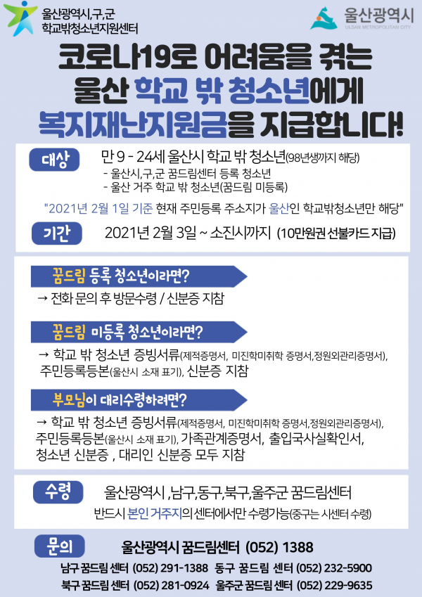 [충청뉴스큐] 코로나19로 어려움을 겪고 있는 울산 거주 학교 밖 청소년 700명에게 오는 2월 3일부터 복지재난지원금이 지원된다.