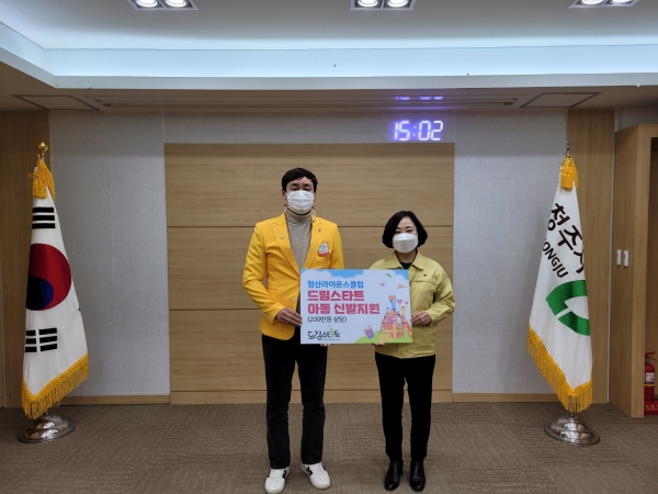 [충청뉴스큐] 청산라이온스클럽이 8일 시청 직지실에서 드림스타트 사례관리 아동 중 초등학생 41명에게 200만원 상당의 아동신발을 지원했다.