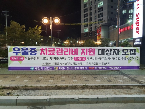 우울증 환자 치료관리비 지원사업은 소득에 상관없이 주민등록상 제천시에 주소를 두고 전문의에게 우울증 진단 후 치료를 받고 있는 시민은 누구나 신청가능하며 제천시정신건강복지센터에 등록 후 관리 받는 것을 동의한 우울증환자에 대해 월2만원까지 우울증 진단, 치료비 및 약물 처방비가 지원된다.
