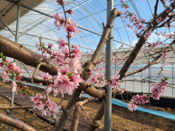 복숭아 시설하우스는 지난해 12월 말부터 가온해, 2월 초순부터 붉은색 꽃송이를 터트리기 시작했다.