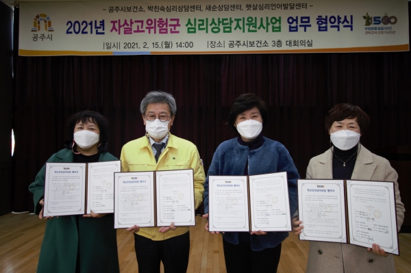 [충청뉴스큐] 공주시는 지난 15일 박진숙심리상담센터와 새순상담센터, 햇살심리언어발달센터 등 관내 심리상담센터 3개소와 자살고위험군에 대한 심리적 회복 및 사례관리 강화를 도모하기 위한 심리지원 협약을 체결하고 상호 협력하기로 했다.